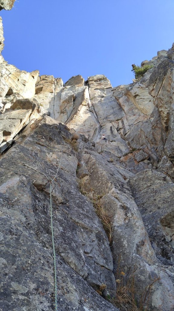 We arrived at the base of the route at 10:40am and starting racking up. The line is extremely obvious, a crack splitting nearly the entire face above. Though the rock up the face is fairly clean by Paint standards, the amount of massive dagger shaped flakes above you is slightly alarming. Not that the shape particularly matters as no matter what, getting hit by a rock that size is going to fuck your day up. But the way they look is just ominous, you certainly wouldn’t want to to be in the gully if one of those things released. Pushing those mental images down, we started the climb. Instead of doing the extremely loose and dirty original start, we chose to go up the alternative first pitch “Fourthplay”, which is what Charles has told me is certainly the recommended way to do it. It follows a rib of clean rock and is largely bolt protected but requires a few awkward (to perform and protect) moves to reach the ledge below the main crack system. Regardless though, it’s a fairly chill pitch to get you into the meat of it.