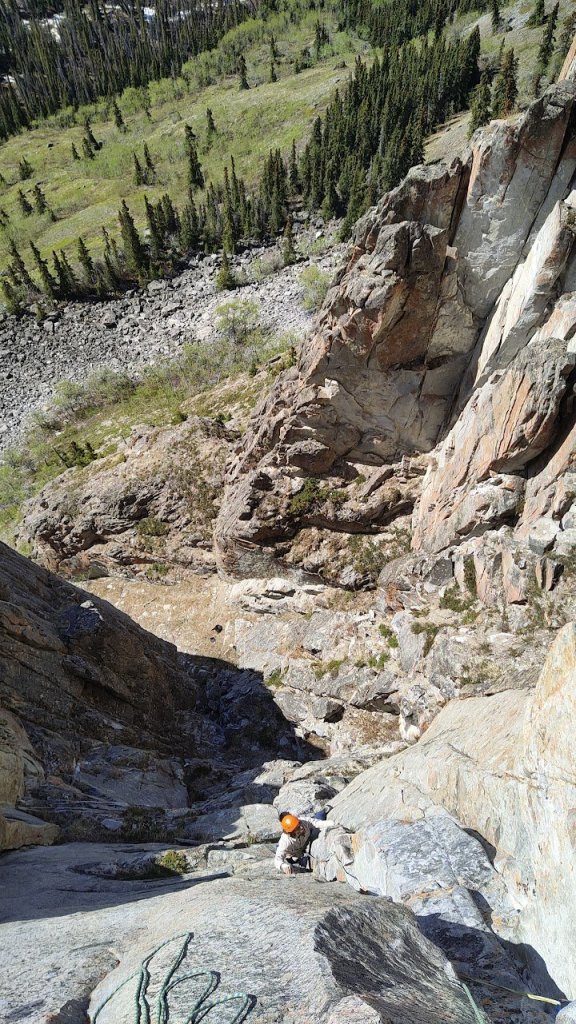 The arrangement of the leads was no coincidence, I knew the crux pitch was largely slab (which Rob hates) and evidently, Rob is a stronger crack climber than me, having cruised Prince Albert. Launching from the tip, I found myself immediately in an extremely blank, 3 bolt traverse slab sequence. This was my shit! It was extremely well protected with shiny bolts and feels like a well choreographed dance. At first it seems improbable but there’s only one way to do it, so you try it, and hopefully you succeed. Thankfully, I did, though frankly it seems like it would be easy to aid across this section if need be. Once past the traverse, you reach an arete, which is actually the upper edge of the corner on Chunder Gully’s crux pitch. I waved hello to Jasper and Martin. From here it’s a couple more bolts following the arete until you get to a short, easy crack feature protected by gear. Sadly, I ended up taking a fall at the last bolt. Though it’s certainly not the crux section, the bolting caused me to fall into a trap I find myself in commonly. The last bolt was in reach and being a wuss, I was hoping to clip it ASAP. The fall didn’t look that clean. I found myself downclimbing a couple times before committing to the moves and trying to go for the clip as soon as I could off of tenuous slab feet (but a juggy hand). But, as expected, my foot popped and I went for a ride. Frustrated with myself, but realizing the fall wasn’t that bad, I got back on and committed fully to the moves until my feet were resting on the nice jug my hand was on previously and I was able to easily clip the bolt below me. After pulling through the easy crack I found myself essentially at the top of P3 of Chunder Gully. From there, I linked into the short ‘Walk of Shame’ traverse. The description calls for a 0.5 placement as well as clipping the one bolt. However, I didn’t find the placement nor did I feel like it was needed. The only thing close to a 5th class move was right at the bolt and from there it was easy scrambling up to the ‘Juniper Ledge’.