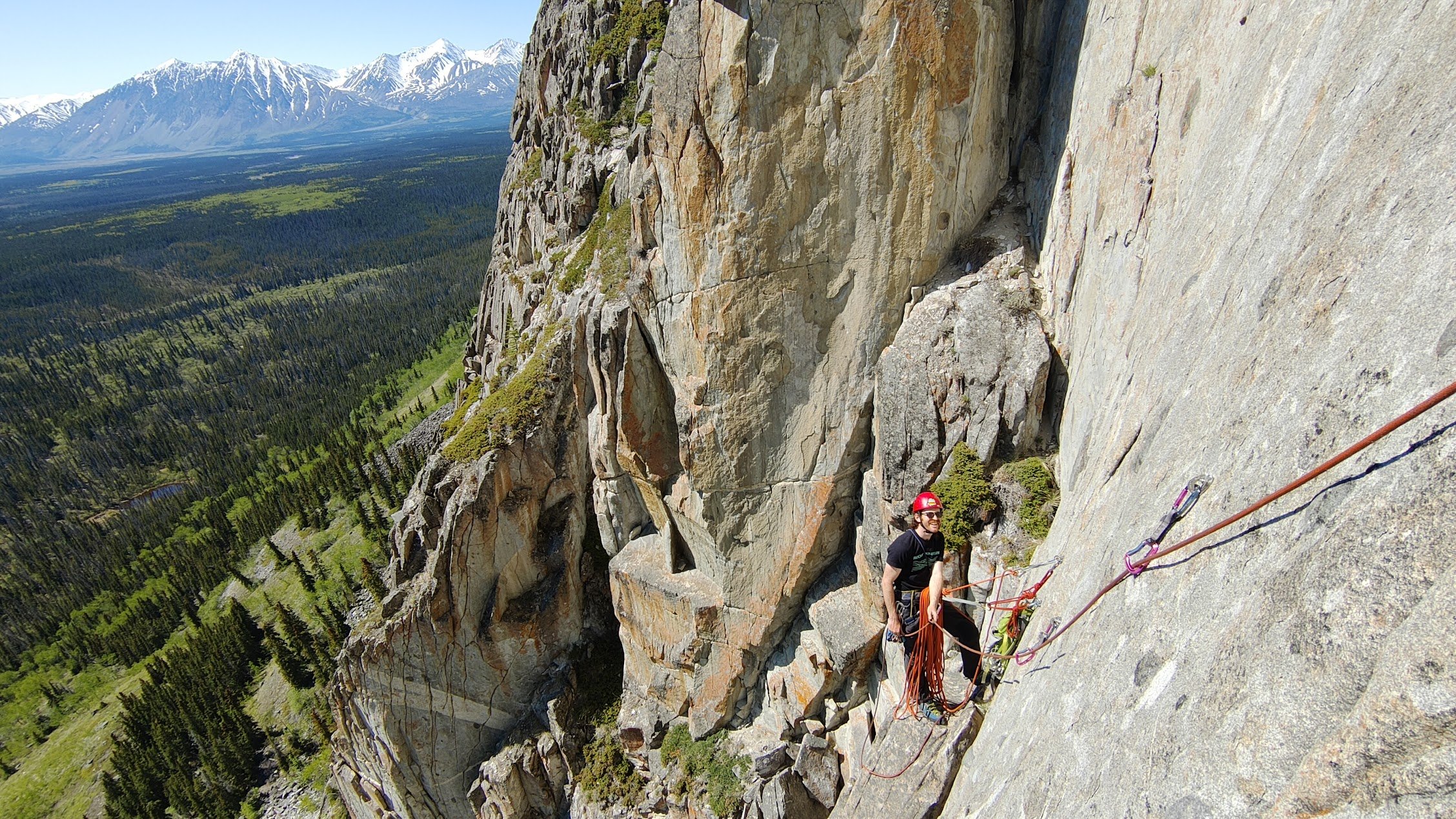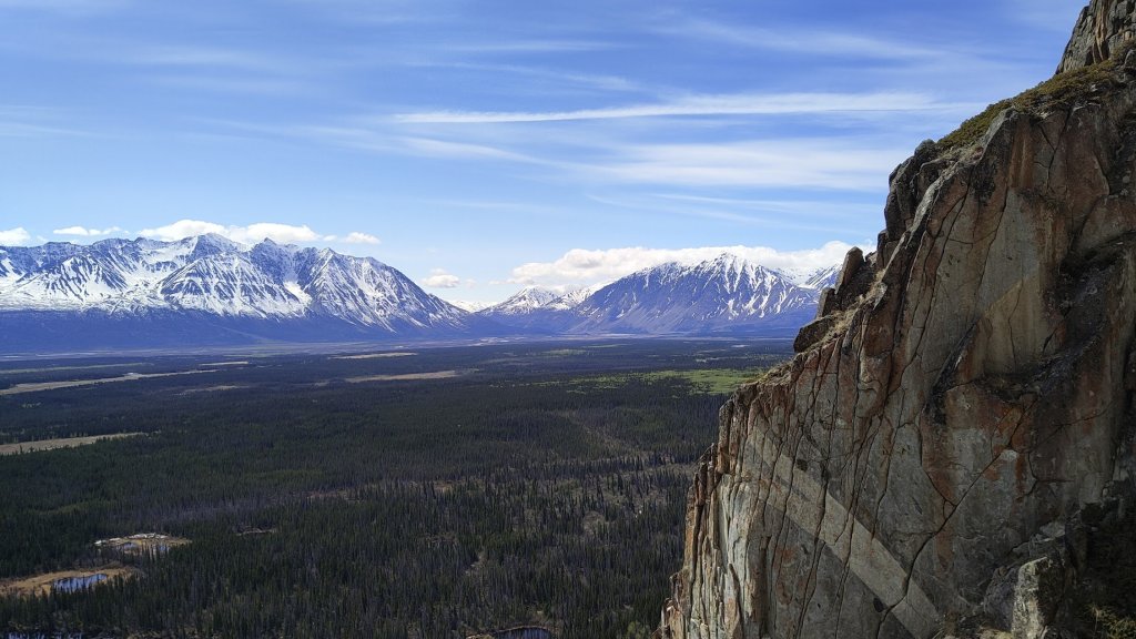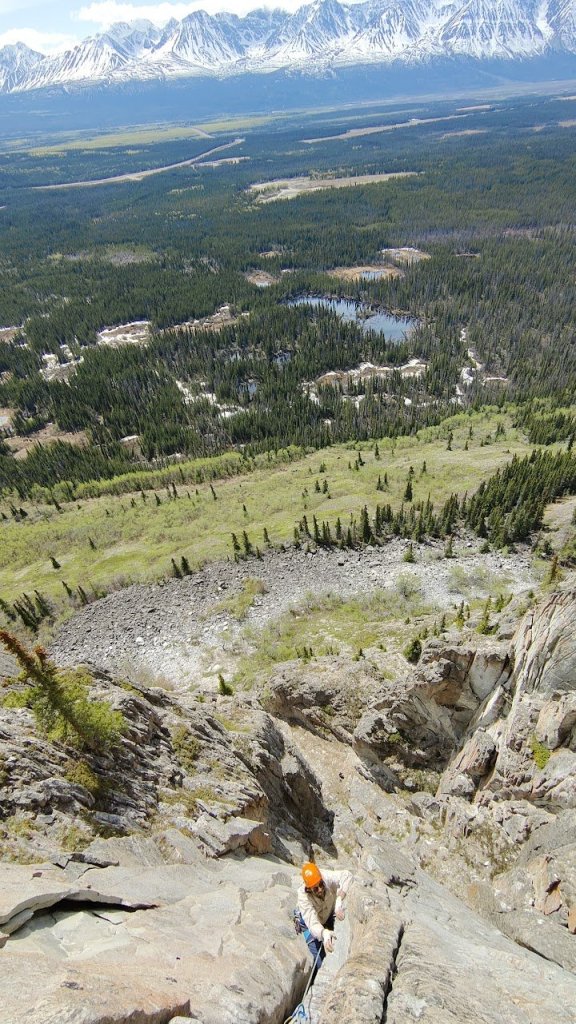 After reaching Juniper Ledge, it was Rob’s lead and we were faced with three choices. Pull Down, Not Out (5.7) to the left, Constant Climax (5.8ish) in the middle, and Nature’s Pocket (11b) to the right. PD,NO requires a 70m to rappel and NP was above our pay-grade for the day. So the obvious choice was Constant Climax. However, this was the money pitch in my mind. Though I only followed, it was clearly one of the best pitches of crack climbing in the Yukon and maybe anywhere. The pitch is somewhat hidden from the belay but with the MP description is easy to find. It’s right there, you just can’t see it because it’s a flake that folds over itself. The flake is quite thin in spots and that’s definitely not the most confidence inspiring for gear. But it feels very strong in most sections, with you able to place gear deep for more confidence. The crux of the pitch comes at a short roof section with great holds, gear, and exposure. An absolutely amazing pitch! Though I personally felt it was closer to 5.9, giving it that grade suggestion on MP which seems to have bumped it up on there.