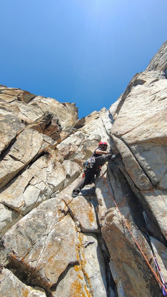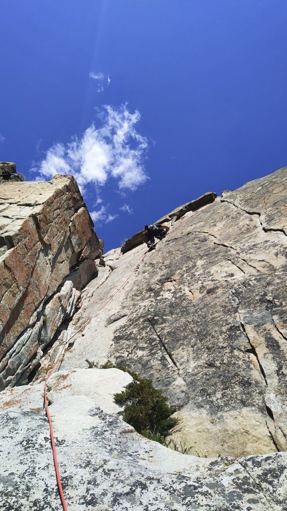 The next two pitches were mine to lead. Starting with a surprisingly steep 5.8 pitch. I was hoping for something cruisy to warm-up for the crux pitch but had a bit more trouble on this pitch than expected. You start in this weird, crossing corners feature which is the start of the major crack feature of the route. I remember the protection feeling a bit tricky but got a good #4 in. I call it ‘crossing corners’ as you have this roof/corner feature above slanting left and a right facing corner on your left shoulder, so they pinch together where the main crack forms. To me, the obvious line was to go through the crack but this ended up being extremely awkward. I felt fine going for a whip there but just couldn’t quite figure out the moves through. So, using a dubiously attached juggy flake, I pulled myself left onto the slabby face beside the right facing corner and did some easy slab moves back into the crack. This was a reasonable (and very cool and exposed) move but if that flake ever rips it’ll be a much harder pitch. From there it was straightforward cracks up to the next belay. Much of the pro on this section is placed between detached blocks within the crack. Hard to say if any of those pieces are bomber. Maybe cams would provide a compressive force holding the rock in? Maybe it’d rip out? Who knows but the climbing is relatively easy so an overall chill pitch.