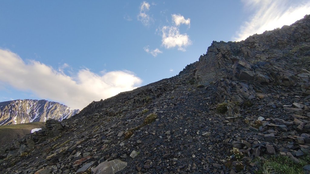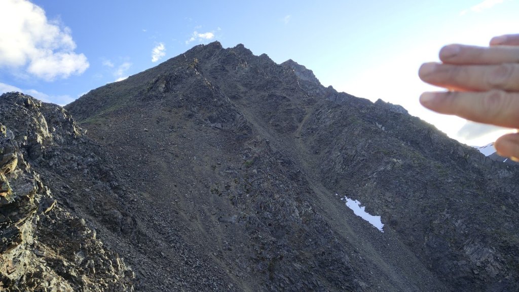 My hips were hurting, which is generally a warning sign for my overuse injury in my knee. But I decided I’d hike a bit further up and take a look at the rocky section to get an idea of whether or not it was reasonable as a scramble. I was thinking that otherwise you’d have to come up, traverse the broad and less steep scree field then contour up to the peak, it would be circuitous and sloggy, but likely doable. I reached the first rocky knoll, with a short cliff band and lots of scree. It looked passable to me and so I decided to continue on and figured it would get too difficult past that, with many rocky spires visible along the ridge to the peak. I by-passed the small cliff band going up short loose gullies to the left. And then…I just kept going. I would hit a spire, find an easy way around, then keep going. I told myself once it got too sketchy I would turn around but it was much easier than it looked. More often than not, the steep features could be contoured left as the backside of the peak was just a large broad slope of scree. However, it was fun to contour right on steeper terrain where things didn’t feel too exposed or sketchy, passing rocky spires and steep gullies down the north face (which have surely been skied in winter). Eventually I found myself plodding up the final scree slope to the summit of the peak.