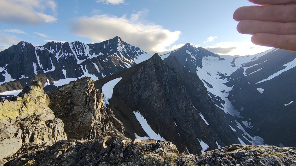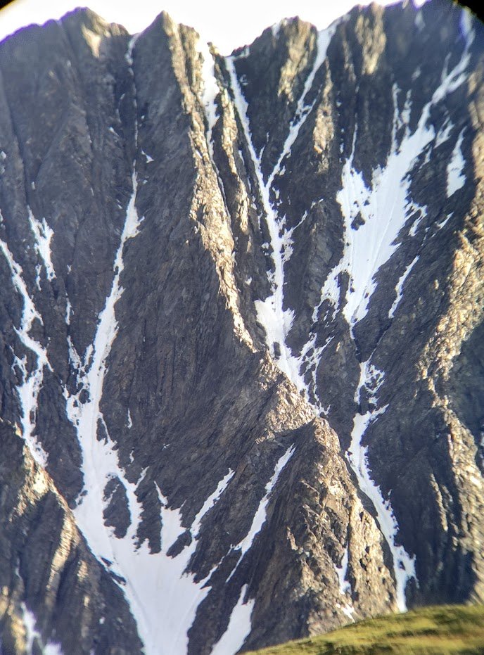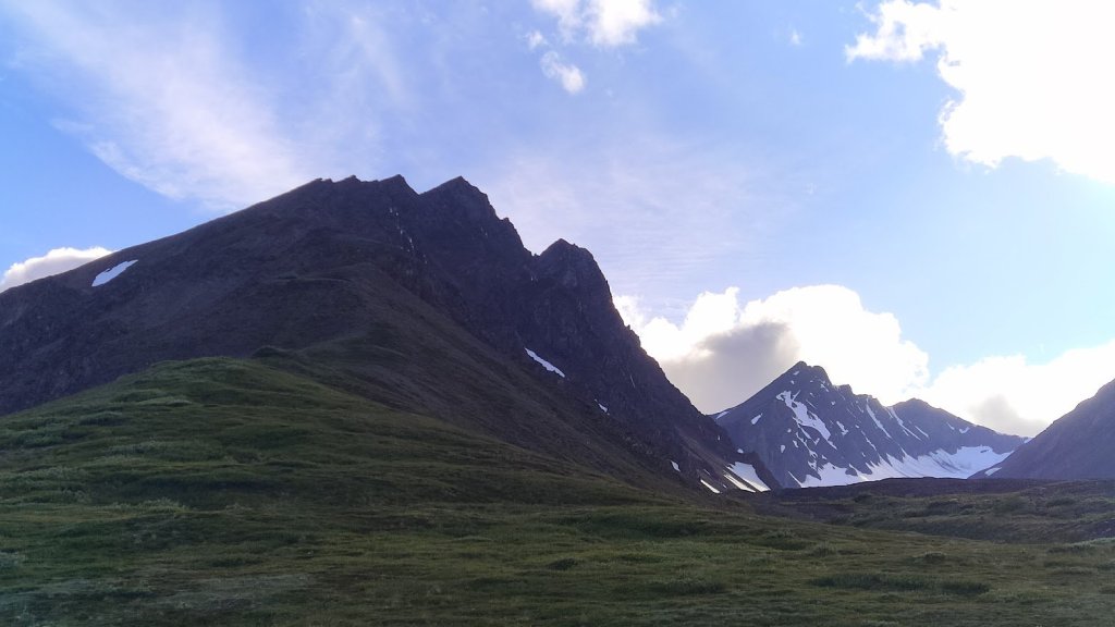 I hung out for a short time, enjoying the amazing views and the fact that I’d somehow only gotten up to the summit (1100m of elevation gain) at 9pm, 3 hours at a very casual pace. Maybe nothing too impressive for the endurance athletes out there but I was happy to see my training was paying off. I enjoyed watching a goat scramble across the gully between the peak I stood on and the next and watched it climb up the steep rock of the ridge. I have to say, I envy it’s abilities, but if I had to be a mountain goat I don’t think I’d want the St. Elias as my home range, every movement it made created a cascade of rockfall. I saw the peaks in the back of the valley I just hiked up with the snowfields, realizing at the end of the cirque was actually a very small glacier. I thought this could be a great, potentially easy mountaineering trip. I reversed the ridge, scrambled sketchily down the bulge, and ended up back at the car at 11pm, ~5 hours after I started.