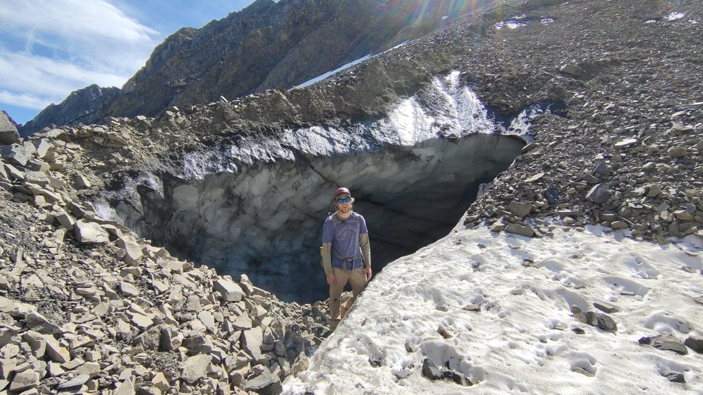 A little way up from the mouth of the creek, we spotted a small opening to an ice cave and went to check it out. It was a super cool feature, not like a typical glacial crevasse. Instead it seemed to be the ice core of the rock glacier exposed. Unlike the old Kluane Ice Cave, this one dropped off extremely steep from the mouth, thus not really possible to enter it unless you wanted to rappel in via some ice screws. After a bit of time checking it out and taking photos, some rocks came tumbling down the slope above, nothing too big, but we were reminded of the dynamic nature of the terrain we were in and decided to move on.