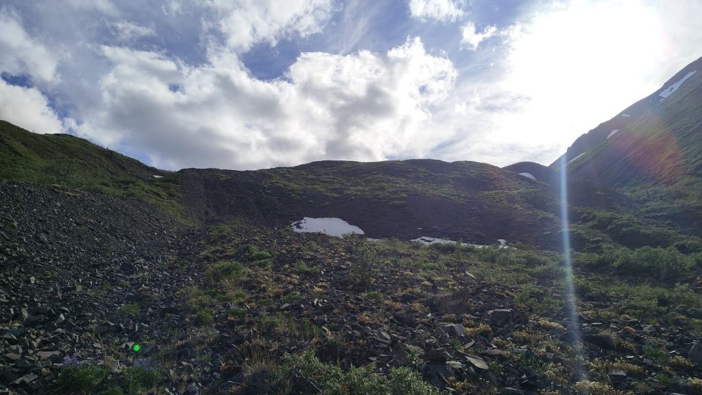 After my day spent working at the GA, I arrived at the trailhead around 6pm. I don’t often hike alone and Kluane bears have a reputation, so I was a little nervous. Alongside my bear spray, I was packing a newly purchased bear banger to give myself a little confidence. Following the trail went easy, I stopped at the interpretive signs along the way and made a casual pace until I reached it’s end near a large bulge of loose rock, which surely has some sort of geological label that I’m unaware of. This was my first major obstacle and ultimately the crux of the day, in my opinion.