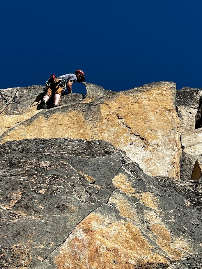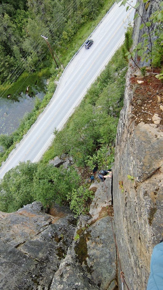In addition, my major project last year was establishing a short, moderate multipitch. Named Let Them Eat Cake. Once you are breaking into multipitches, this is a great first trad multipitch in the territory. It has much less committing climbing compared to other moderate trad multis. Set up to easily bail with a single 60m rope and descend via walk-off. The one 5.9 crux on the first pitch is bolted and all other cruxes protect well with gear. The first pitch alone would be a worthwhile route to climb if you’re out there cragging. It is less than 30m, so easily descended in one rappel/lower. But due to the traversing nature, you’ll want your follower to clean the pitch.