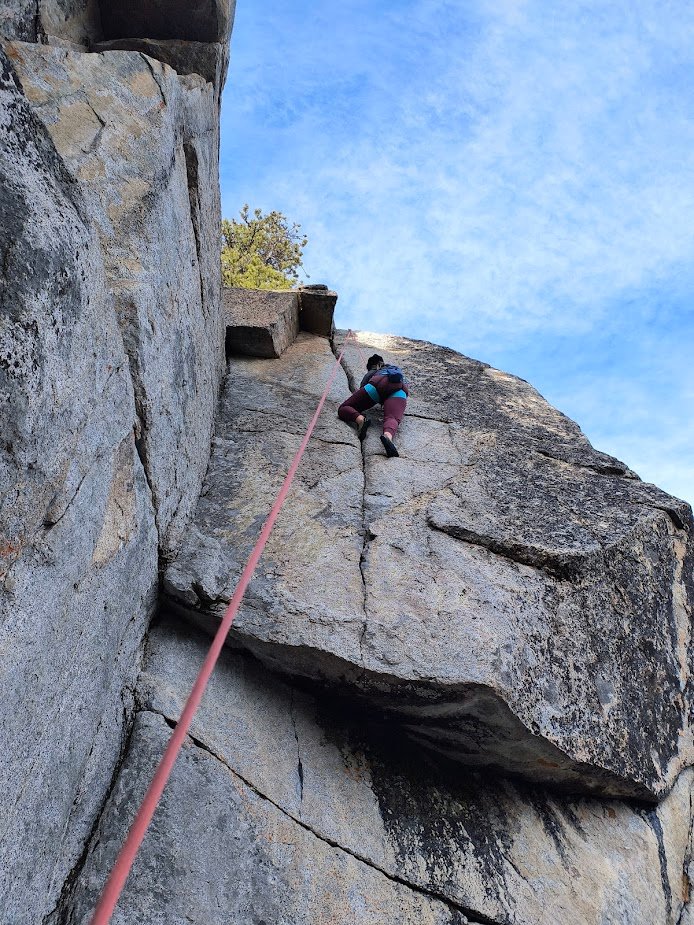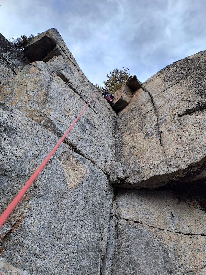 - The lower crack can be very slippery and is a bit of a weird shape, I’ve found that cams can easily walk into a bad placement here or can be extremely fiddly. But it’s very fun to practice your jams! If you end up laybacking this, it will feel much less secure on lead.